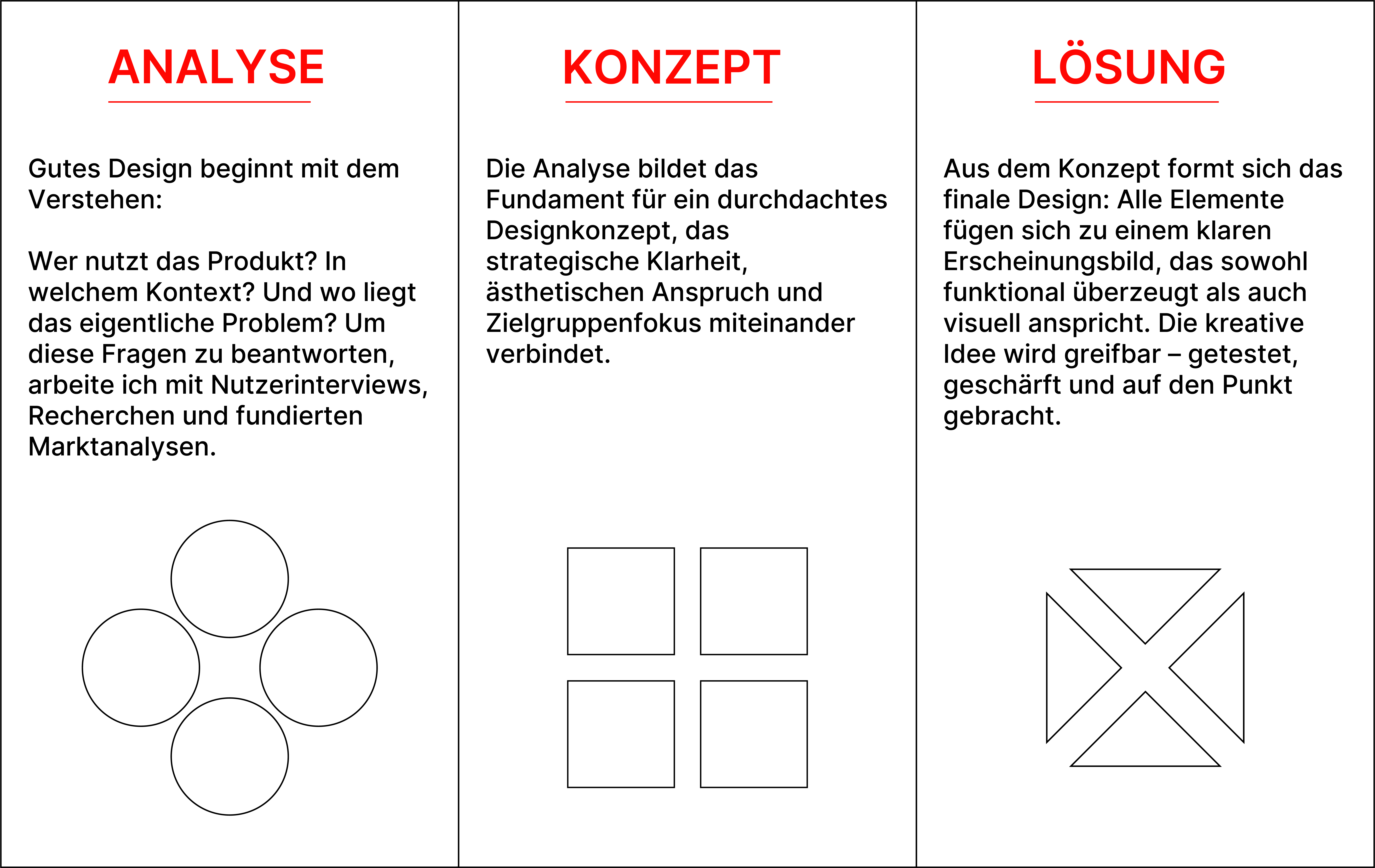In meinem Designansatz folgen die Phasen Analyse, Konzept und Lösung nacheinander, bauen systematisch aufeinander auf und führen von der Problemstellung zur gestalterischen Umsetzung.